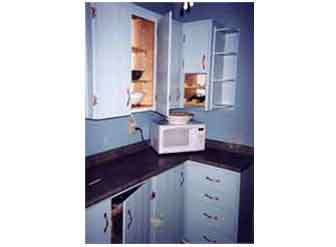 What looks like a very small kitchen in this photo is actually an extension of the unseen portion (outside the left part of the photo). This new section matches the look of the other half of the kitchen, adding lots of new counter-top & cabinet space.