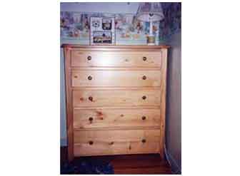 This 5-drawer dresser is made of stained pine to match the rest of the room's furniture. Pine is easy to work with, looks great in most rooms, and is very popular.